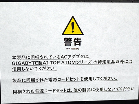 なお、製品パッケージには「製品に同梱された電源コードセットを使用してください」「本製品に同梱されているACアダプタは、GIGABYTE製AI TOP ATOMシリーズの特定製品以外に使用しないでください」「同梱された電源コードセットはほかの製品に使用しないでください」と注意書きがある。