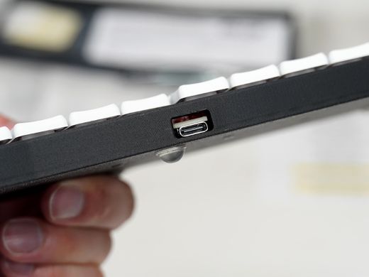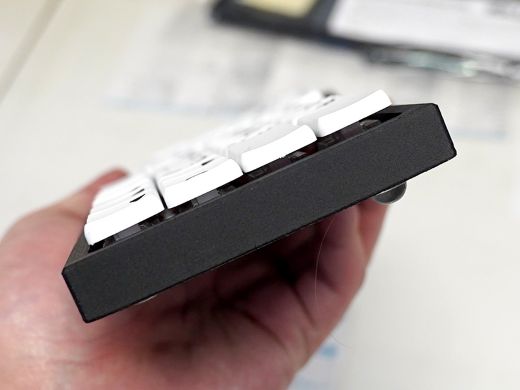 右手側を10度傾け少しズラしたキー配置で、省スペースながら余裕のある操作感を実現しているという。