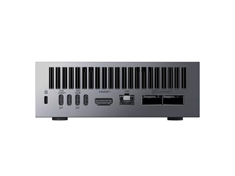 インターフェイスは3×USB 3.2 Gen 2x2 Type-C, 20Gbps, alternate mode (DisplayPort)、1×USB 3.2 Gen 2x2 Type-C, with PD in (180W EPR PD3.1 SPEC)、1×HDMI 2.1、1×NVIDIA ConnectX-7 SMART NIC、1×10G LAN。