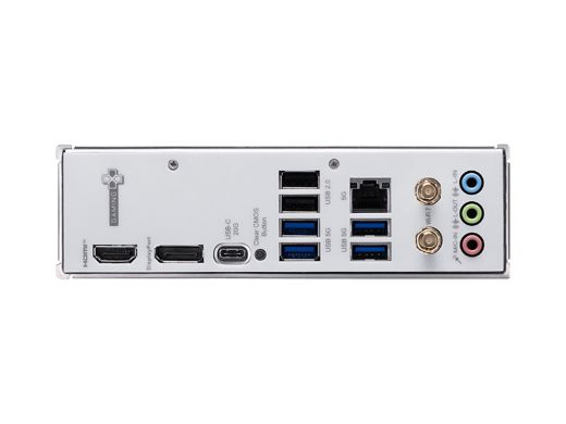 背面インターフェイスはUSB Type-C 20Gbps、USB 5Gbps、USB 2.0、Wi-Fi 7+Bluetooth 5.4、5GbE LAN(Realtek)、HDMI 2.1、DisplayPort 1.4、音声入出力。