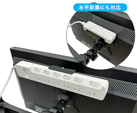VESA規格に対応した電源タップホルダーで、モニターアームとの併用も可能。幅約32mm~約52mmまでの電源タップを取り付けることができる。