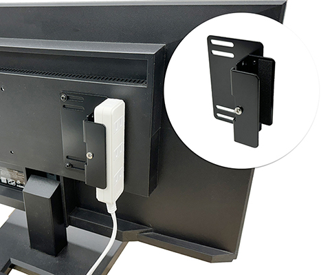 VESA穴を利用して電源タップをモニター裏に設置できるホルダーが長尾製作所から