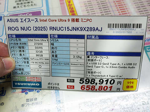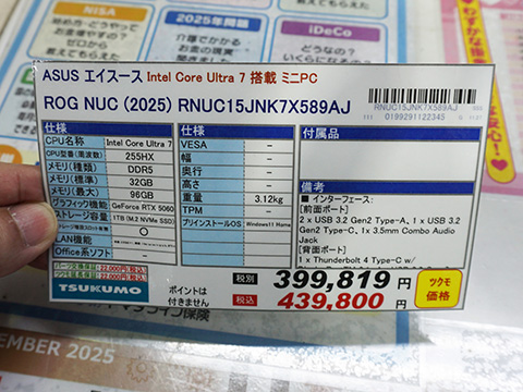 ASUSの小型ゲーミングPC「ROG NUC(2025)」シリーズが登場。今回入荷したのは、Core Ultra 7 255HXやGeForce RTX 5060を搭載した「RNUC15JNK7X589AJ」と、Core Ultra 9 275HXやGeForce RTX 5080を搭載した「RNUC15JNK9X289AJ」の2種類。