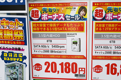 前回調査で特価18,925円だったSeagate「BarraCuda」ST8000DM004(8TB)が、今回調査では5,055円(26.7%)高の23,980円(1GB単価3.00円)に急騰。2万円を切る8TBモデルが店頭から消滅した。8TBの最安値が2万円以上となるのは2018年(平成30年)4月以来7年半ぶりで、令和の御代になってからは初めてのことだ。(続きを読む)