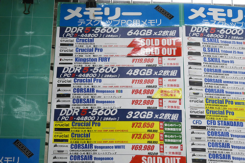 メモリの高騰が前回よりさらに激化。中でも目を覆うばかりなのは大容量の64GB×2枚組で、「DDR5-5600」は44,151円(58.2%)高の119,980円(Kingston)、「DDR5-6000」は70,280円(117.5%)高の130,080円(CORSAIR)、「DDR5-6400」は55,630円(79.0%)高の126,030円(Crucial)に上昇した。モデル数が元々少ないところへ品切れも目に付く。(続きを読む)