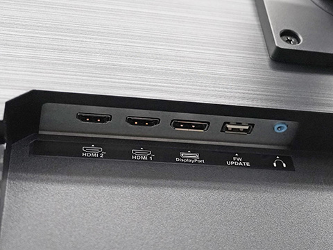 映像入力端子はHDMI(HDCP 2.2)×2、DisplayPort(HDCP 2.2)×1。スピーカー(2W+2W、ステレオ)、ヘッドホン端子(ステレオミニジャック)も装備する。
