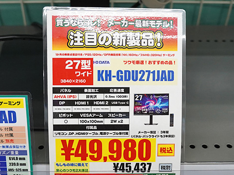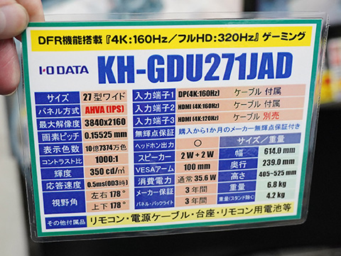 「Dual Frame Rate機能」(以下「DFR機能」と表記)と「Focus Mode機能」(以下「FM機能」と表記)を搭載したアイ・オー・データ機器の27型モニター「KH-GDU271JAD」がツクモパソコン本店IIに入荷。同店では実機展示が用意されている。