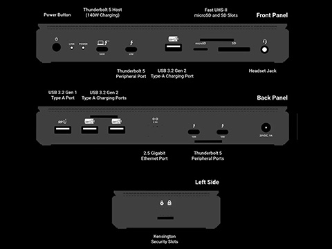 Thunderbolt 5ポート×4、2.5ギガビットイーサネットポート(RJ-45)×1、USB 3.2 Gen 2 Type-A×3、USB 3.2 Gen 1 Type-A×1、3.5mmオーディオ複合ジャック×1、UHS-II SDカードスロット×1、UHS-II microSDカードスロット×1を備え、2台の8Kモニターや最大3台の4Kモニターをサポートする。