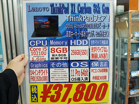 PCコンフル 秋葉原4号店の販売モデルはCore i7-10750H/メモリ16GB搭載の15.6型「ThinkPad P1 Gen3」、Core i5-10210U/メモリ8GB搭載の14型「ThinkPad X1 Carbon 8th Gen」、Core i5-8350U/メモリ8GB搭載の14型「ThinkPad X1 Carbon 6th Gen」で、店頭価格は順に69,800円、37,800円、24,800円。保証は30日。