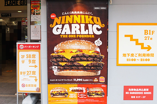 バーガーキング 秋葉原昭和通り店では、期間限定メニューの「にんにく・ガーリック ザ・ワンパウンダー」が販売されていました。総カロリー1,638 kcal、総重量525gの人気メニューの復刻版です。