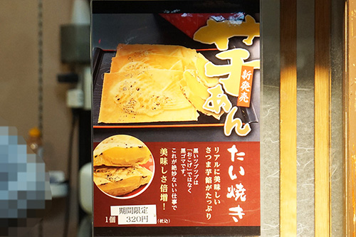 たいやき神田達磨 秋葉原店では、期間限定メニューの「芋あんたい焼き」が販売されていました。程よい甘さの芋あんと、胡麻をまぶしたカリカリとした耳付きのたい焼きの香ばしさがマッチした、個人的におすすめな冬季限定メニューです。