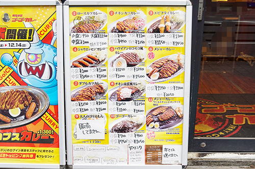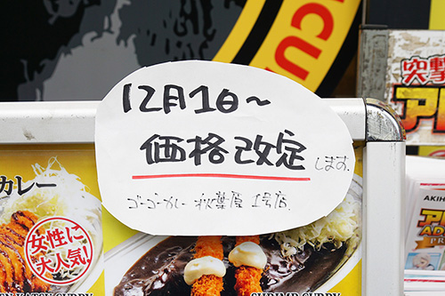 ゴーゴーカレー 秋葉原1号店の店頭に価格改定の告知がでていました。掲載写真は改定前の価格で、12月1日から各メニュー50~100円程の値上がりとなるようです。