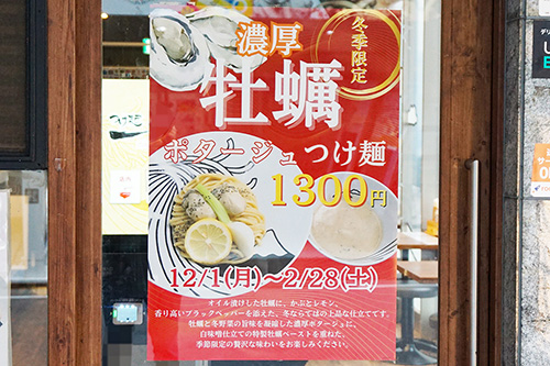 つけ麺一頂 秋葉原店では、期間限定メニューの「濃厚牡蠣ポタージュつけ麺」が1,300円で販売されていました。2026年2月28日(土)までの冬季限定メニューとなっています。
