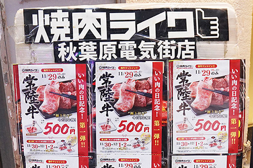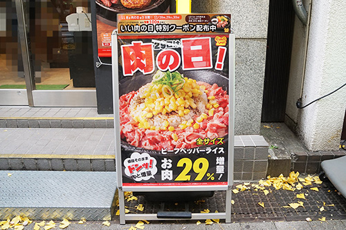 取材日の11月29日は「1129(いい肉)の日」ということで、肉料理を扱う飲食店が様々なキャンペーンを行っていました。毎月29日は「29(肉)の日」の語呂合わせでセールなどが行われていますが、今月はより一層力が入っている感じがしました。