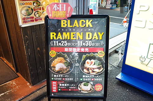 横浜家系ラーメン 壱角家 秋葉原店では、「BLACK FRIDAY」にちなんだ「BLACK RAMEN DAY」を開催。期間限定で黒ラーメンメニューの販売が行われていました。