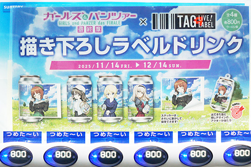 サントリー自販機などで販売している「TAG LIVE LABEL」のオリジナルラベルドリンクが、秋葉原各地で多数販売中。様々な作品の描き下ろし「コラボラベル」になっている自販機限定のドリンクで、ラベルがそのままステッカーになっています。