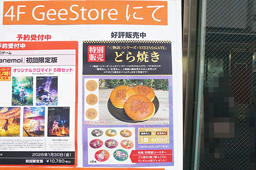 オノデン4階のキャラクターグッズなどを販売する「ジーストア・アキバ」では、<物語>シリーズ×STEINS;GATEコラボのどら焼きが販売されていました。「珈琲あん/紅茶あん」の2種類の味から選べるコラボどら焼きで、1個600円。どら焼き1個注文ごとに紙製コースターを1枚プレゼントしています。
