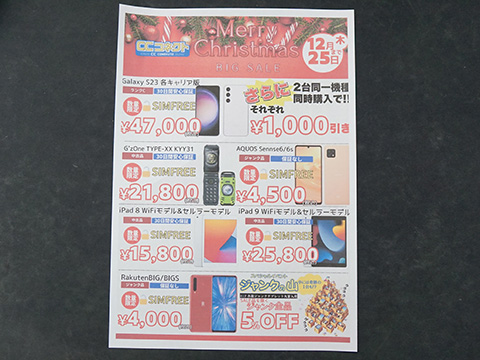 セール品のラインアップと価格の一例をあげると「Galaxy S23」の中古品が47,000円、「第9世代iPad Wi-Fi + Cellularモデル」の中古品が25,800円、「G'sOne TYPE-XX KYY31」の中古品が21,800円。このほか、セール品を除くジャンク品がすべて5%オフになるようです。