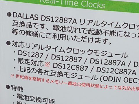 対応モジュールはDS1287、DS12887、DS12887A、DS12B887。また、「限定的に対応可能?なモジュール」としてDS12C887、DS12C887Aを挙げており、NVRAMのサイズの関係で、「試してみないと判らないというのが正直なところ」とのこと。