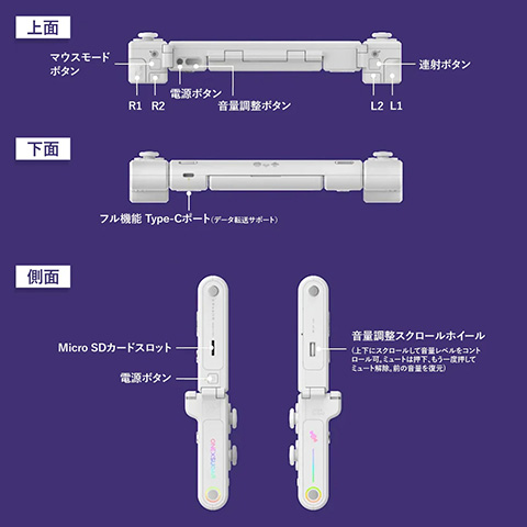インターフェースはフル機能USB Type-C、microSDカードスロット。デュアル振動モーター、シングルリニアモーター、3軸ジャイロ+3軸加速センサー、Wi-Fi 7、Bluetooth 5.3、スピーカー、マイクも搭載する。