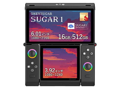 ONEXSUGAR SUGAR1は、メイン(6.01インチ、1,080×2,160)とセカンド(3.92インチ、1,080×1,240)の2つのOLEDディスプレイ、Snapdragon G3 Gen 3、Android 14を搭載した携帯型ゲーム機。メモリ容量は16GB。ストレージ容量は512GB。