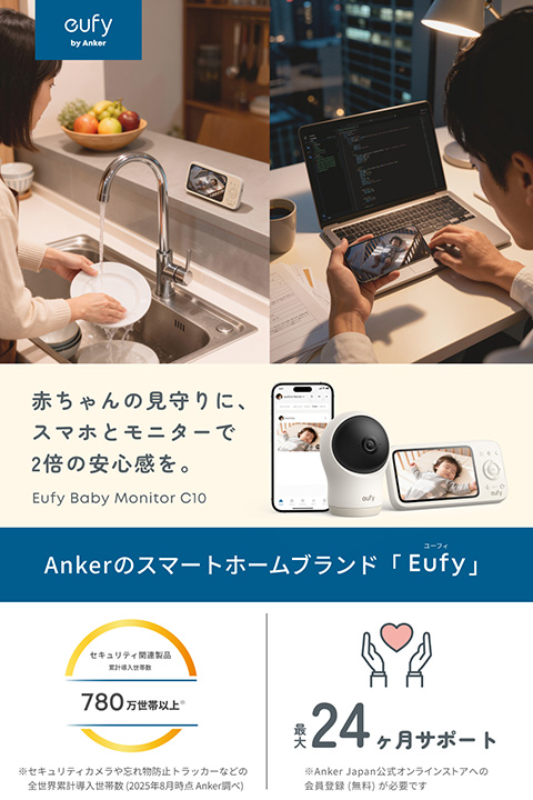 Eufyブランドからベビーモニター「Eufy Baby Monitor C10」が登場する。アンカー・ジャパンはAmazon.co.jp、Anker Japan公式オンラインストアなどにて12月9日(火)より販売開始するとしている。