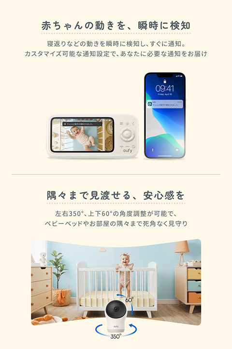 水平350°、垂直60°の可動域と広角レンズにより、ベビーベッドや子供部屋の隅々まで見守ることができるとしている。また、赤ちゃんの泣き声や室温の変化、寝返りなどの動きも検知し、通知するという。ナイトモード、4倍ズーム機能も搭載する。