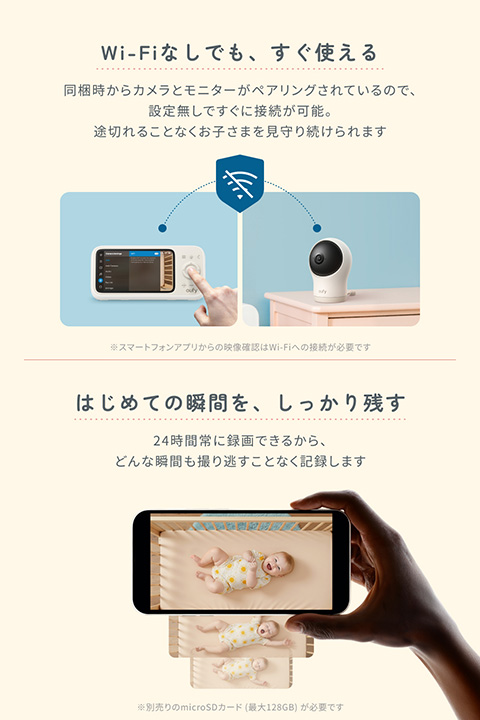 上記のほか、赤ちゃんの入眠をサポートするという5種類のホワイトノイズ、周囲のノイズを低減し声などをクリアに届けるというノイズリダクション、はじめての瞬間や貴重な成長もしっかりと記録するという24時間録画などの機能も搭載する。24時間録画を行うには別売のmicroSDカード(最大128GB)が必要。