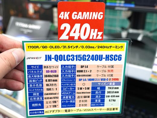 量子ドット技術採用の有機ELパネル(QD-OLEDパネル)を搭載した31.5インチ湾曲4Kゲーミングモニター「JN-QOLC315G240U-HSC6」がJAPANNEXTから登場。