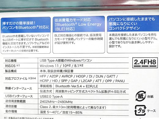 Bluetooth 5.4対応のUSB 2.0接続アダプタ。最大10mまで通信できるとしている。