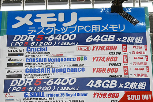 DDR5 DIMMの大幅上昇は今回調査でも継続。64GB×2枚組は特に激しく、「DDR5-5600」が59,200円(49.3%)高の179,180円(Crucial)、「DDR5-6000」が40,420円(31.1%)高の170,500円(CORSAIR)、「DDR5-6400」が43,950円(34.9%)高の169,980円(CORSAIR)、「DDR5-6400」CUDIMMが95,180円(112.2%)高の179,980円(Crucial)だ。(続きを読む)