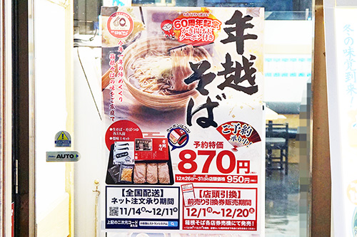 名代 箱根そば 秋葉原店では、年越しそばの予約をスタート。予約購入すると3人前が870円で購入可能で、通常販売価格より80円ほど安く購入できます。「全国配送」分の予約は11日で終了となりますが、「店頭引換」分については、12月20日(土)まで店内券売機で購入可能とのことです。