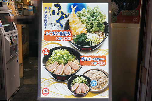 また、期間限定メニューとして「ふぐ天と春菊天そば」/「鴨そば~九条葱のせ~」を販売していました。