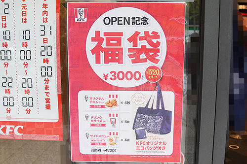 12月5日、ワテラスに「ケンタッキーフライドチキン御茶ノ水ワテラス店」がオープン。取材時にはオープン記念福袋を3,000円(無くなり次第終了)で販売していました。