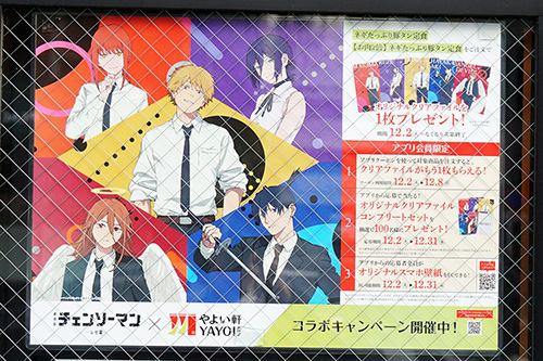 やよい軒外神田3丁目店では、劇場版「チェンソーマン-レゼ篇-」とのコラボキャンペーンが開催されていました。「ネギたっぷり牛タン定食」の注文でオリジナルクリアファイルが貰えるほか、様々な連動キャンペーンを実施しています。