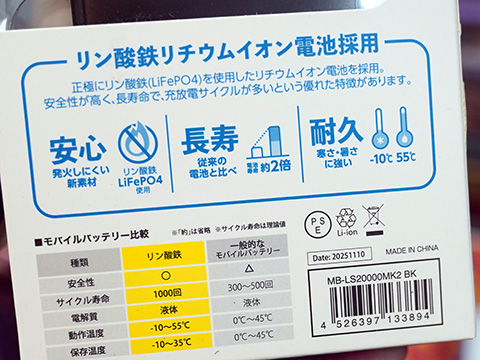 これらは正極に発火しにくいというリン酸鉄リチウムイオン電池を採用したモバイルバッテリー。