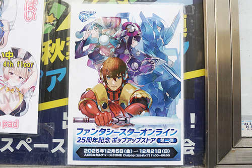 AKIBAカルチャーズZONE 4階のカルポップでは、「ファンタシースターオンライン」の25周年記念ポップアップショップ第二弾が開催されていました。25周年記念イラストをあしらった新規グッズや、過去に販売していた「NGS」や「PSO2」のグッズ販売などを行っています。開催期間は12月21日(日)まで。