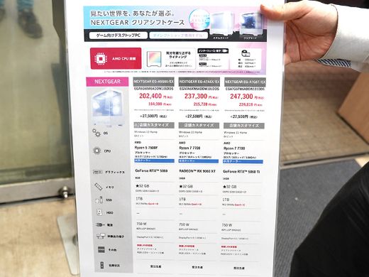 ダイレクトショップ専用モデルで、店頭受注モデルの価格はRyzen 5 7500F/GeForce RTX 5060搭載の「EG-A5G60/EX」が202,400円、Ryzen 7 7700/Radeon 9060 XT搭載の「EG-A7A6X/EX」が237,300円、Ryzen 7 7700/GeForce RTX 5060 Ti搭載の「EG-A7G6T/EX」が247,300円。