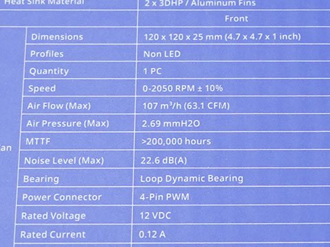 ファンは回転数違いの同社120mmファン「Mobius 120」が2つ付属する。仕様はフロントファンが回転数2,050RPM/風量63.1CFM/静圧2.69mmH2O/騒音値22.6dBA、リアファンが同1,850RPM/50.5CFM/1.77mmH2O/20dBA。