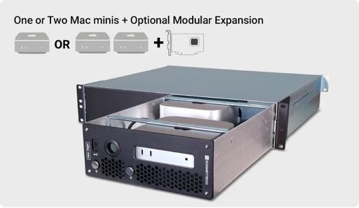 Mac mini(M4 2024以降)に対応したラックマウント用システムで、2Uラックマウント筐体に1台または2台の対応Mac miniを組み込むことができる。本体サイズは483×419×91mm。
