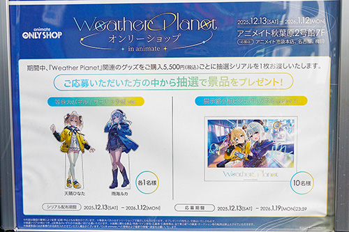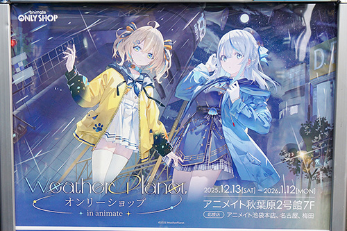 アニメイト秋葉原2号館の7階では、個人VTuber「雨海ルカ」と「天晴ひなた」による音楽ユニット「Weather Planet」のオンリーショップが開催されていました。開催期間は2026年1月12日(月・祝)まで。