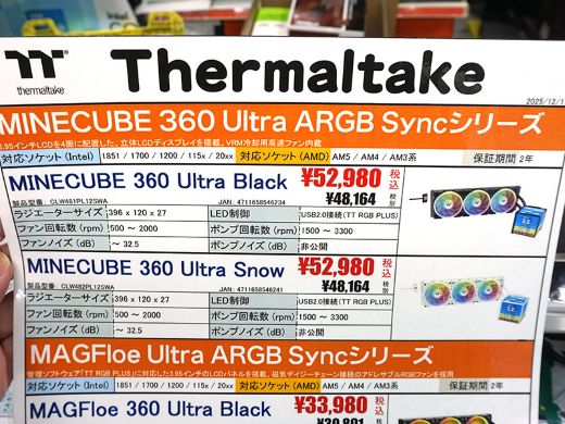 カラーがブラックの「MINECUBE 360 Ultra Black(CL-W481-PL12SW-A)」とホワイトの「MINECUBE 360 Ultra Snow(CL-W482-PL12SW-A)」の2製品で、店頭価格は52,980円。