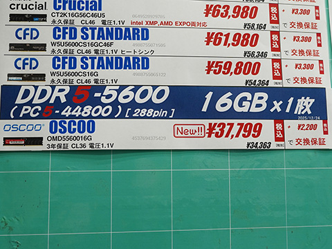 OSCOOのDDR5-5600メモリが店頭入荷、16GB×1枚で37,799円