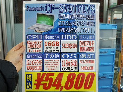Core i7-10810U(6コア/12スレッド)を搭載したパナソニックの12.1型ノートPC「CF-SV9TFKVS」の中古品が、PCコンフル 秋葉原4号店でセール中。