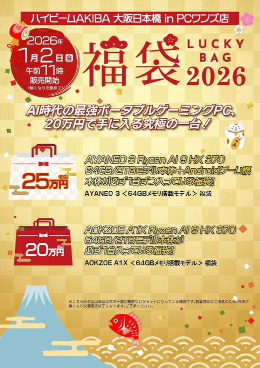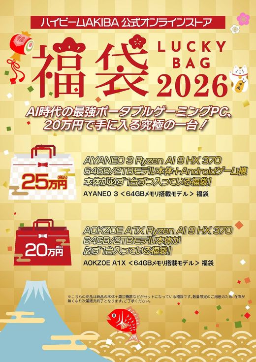 予約販売もスタートしており、発送は2026年1月5日(月)以降。なお同福袋は、ハイビーム 秋葉原本店(2026年1月4日11:00から)、ハイビームAkiba大阪日本橋店inPCワンズ(2026年1月2日11:00から)でも販売予定。