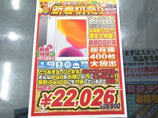 第3世代iPad Air 256GBの国内版SIMフリーモデルが22,026円!中古品セール