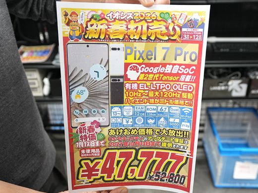 Googleの6.7インチスマートフォン「Pixel 7 Pro(GFE4J)」未使用品が、イオシス各店で1月3日(土)からセール予定。店頭価格は47,777円。12日(月)までのセール品で、保証期間は6か月。