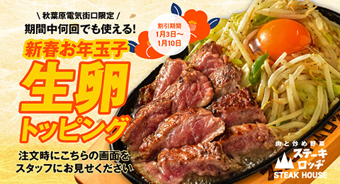 期間中は生卵トッピングが無料!ステーキロッヂ 秋葉原電気街口店の「新春お年玉子キャンペーン」