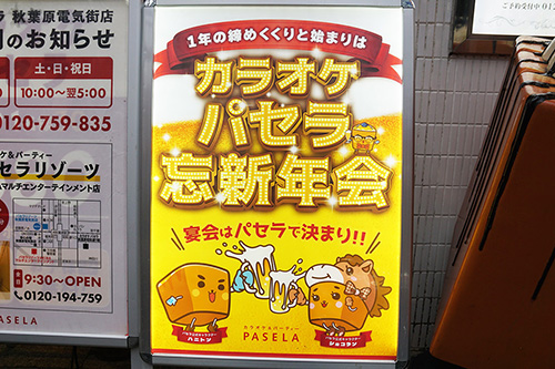 カラオケパセラ 秋葉原電気街店では、新年会の予約を受け付けていました。カラオケ+料理+アルコール含む飲み放題がお得に利用できるプランとなっています。