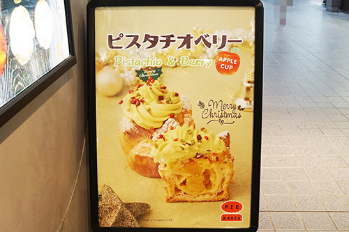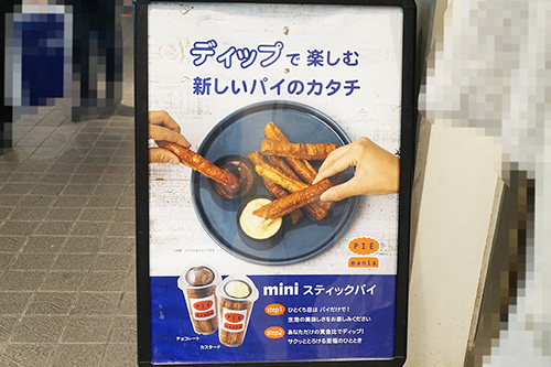 PIE mania アキバ・トリム店では、チョコレートやカスタードクリームをお好みでディップして食べる「miniスティックパイ」が販売されていました。また、期間限定メニューの「ピスタチオベリーアップルパイ」も販売しています。